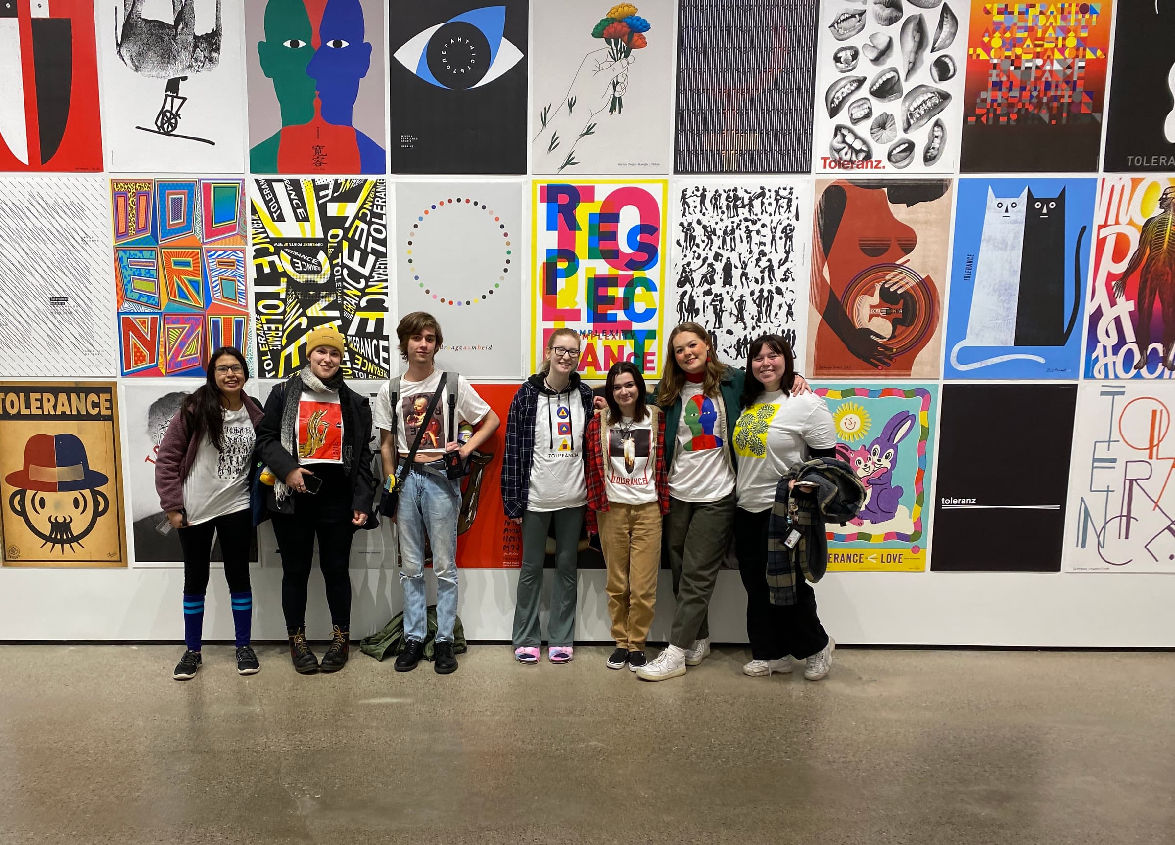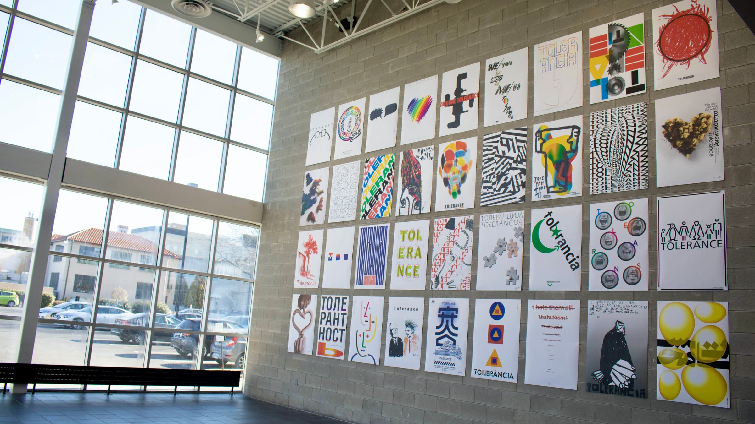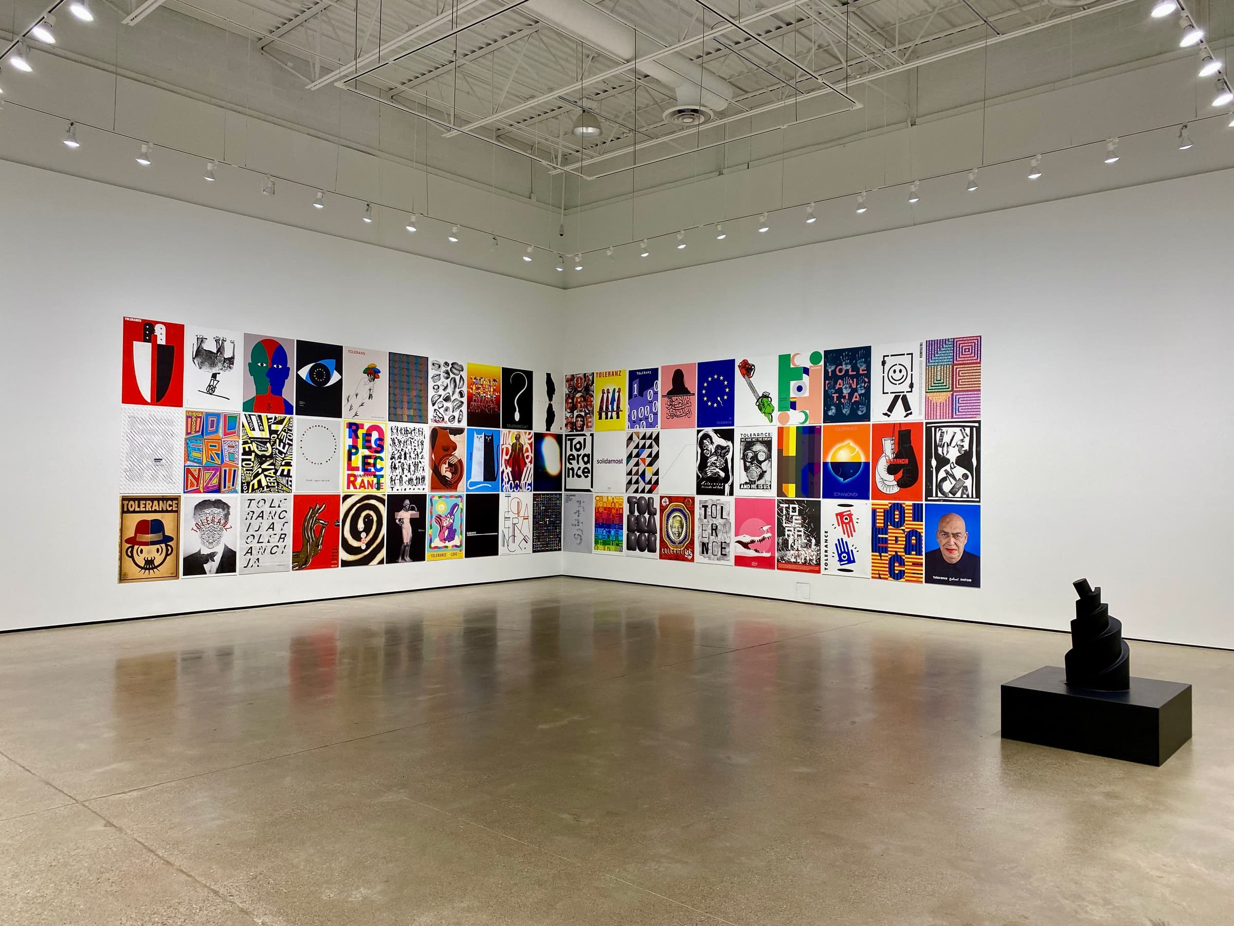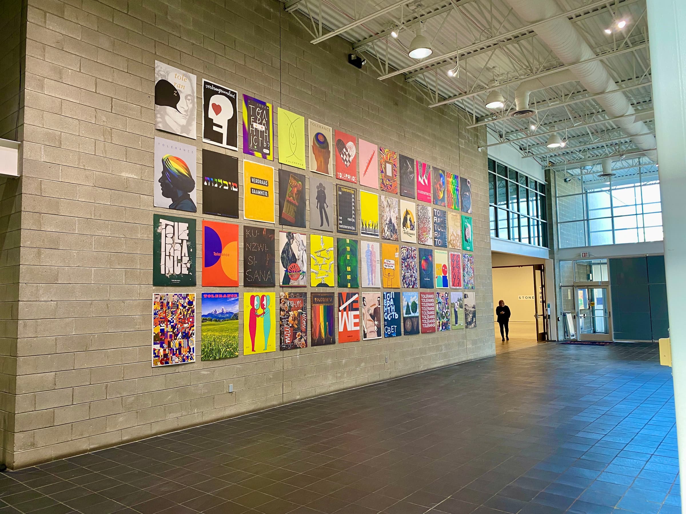 On November 17th, the 150th Tolerance Poster show was unveiled at the Columbus College of Art & Design. The posters are displayed within the Loann Crane Center for Design, the Canzani Atrium Lobby, and the Beeler Gallery. Coinciding with the poster show, Professor Matthew Mohr produced a series of one-off T-shirts containing the Tolerance imagery to be worn by select students at the opening event. Exhibition design by Faculty Director of Galleries, Tim Rietenbach. The posters will be on display in these spaces until February 24th, 2023.