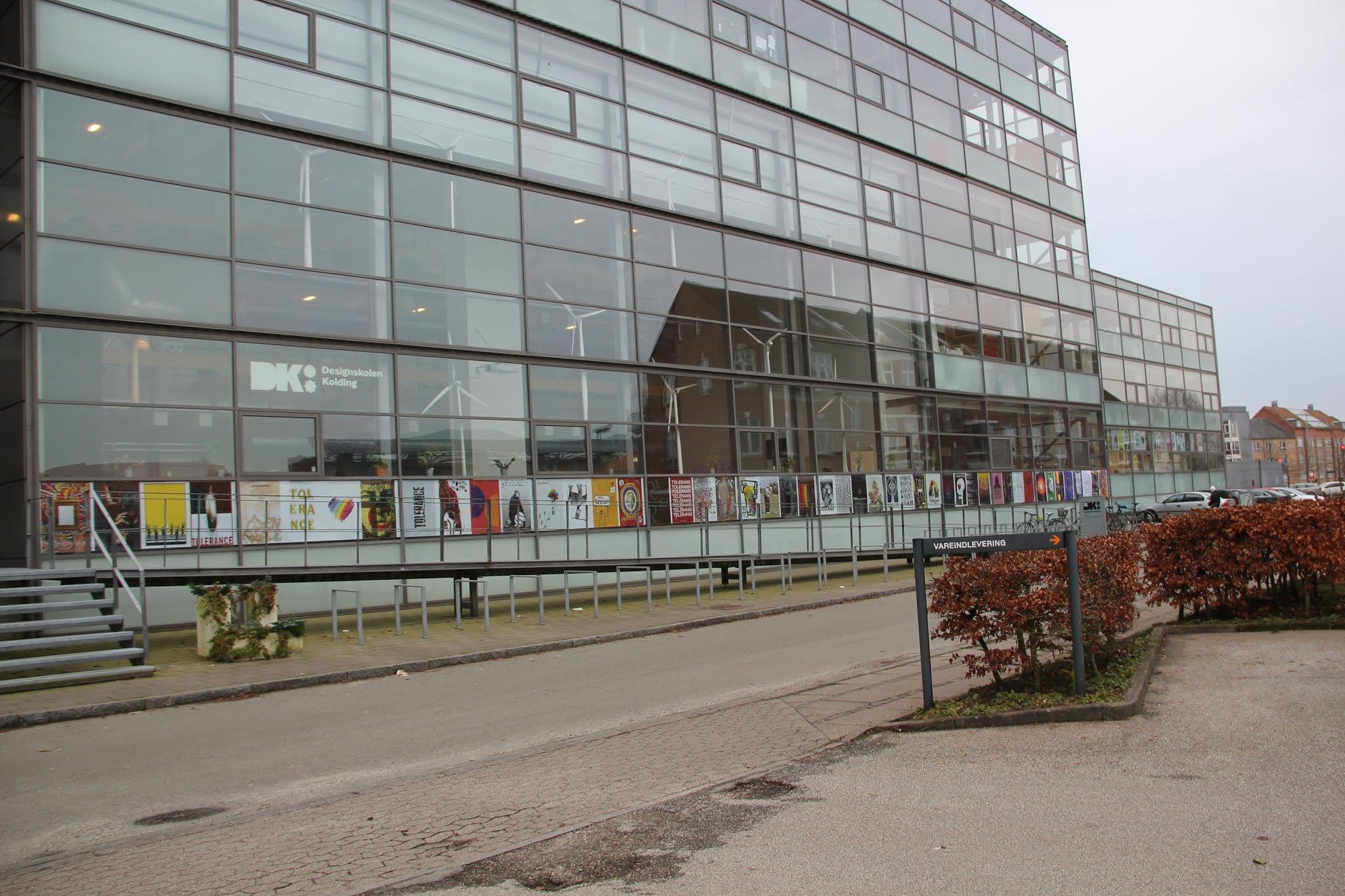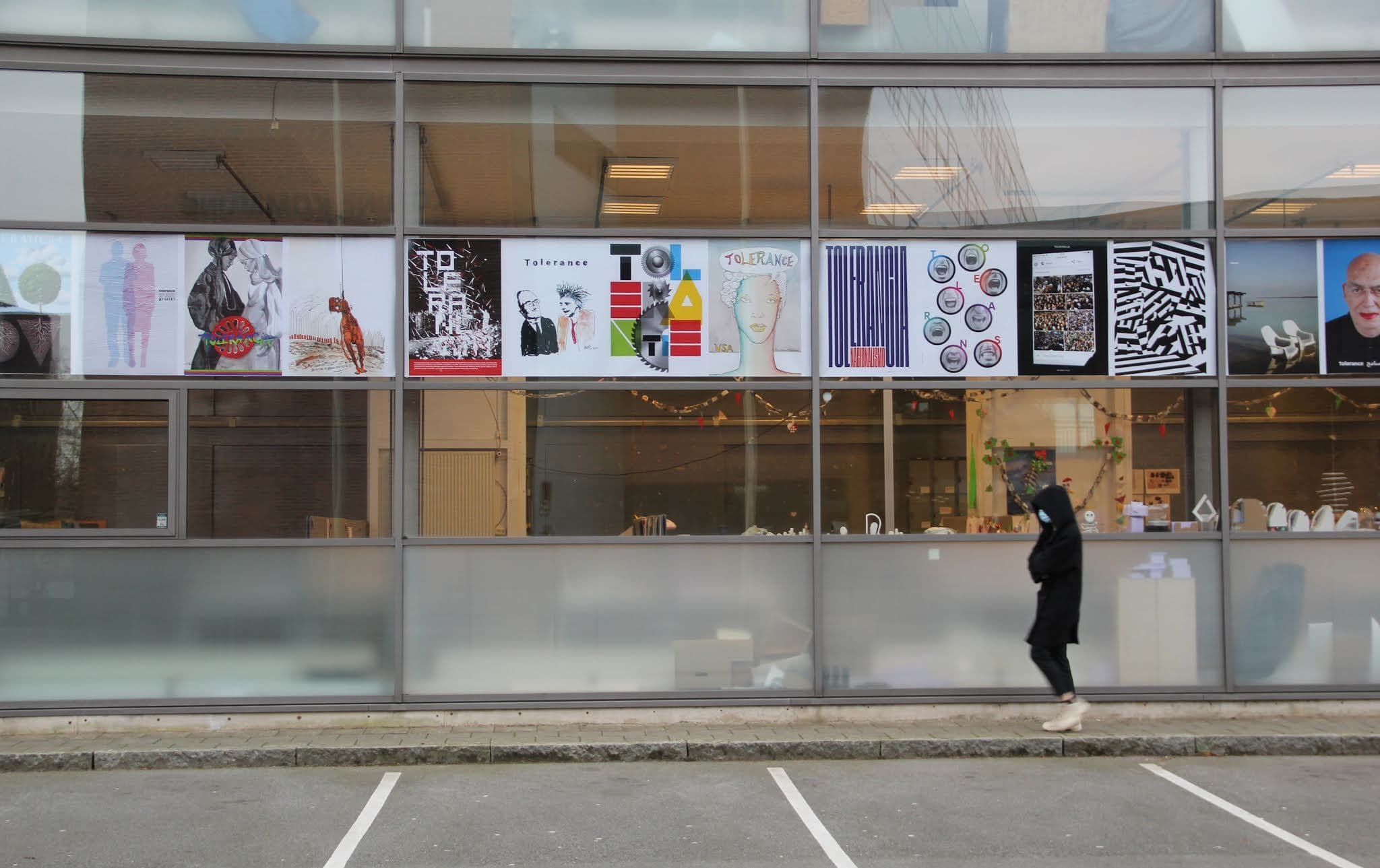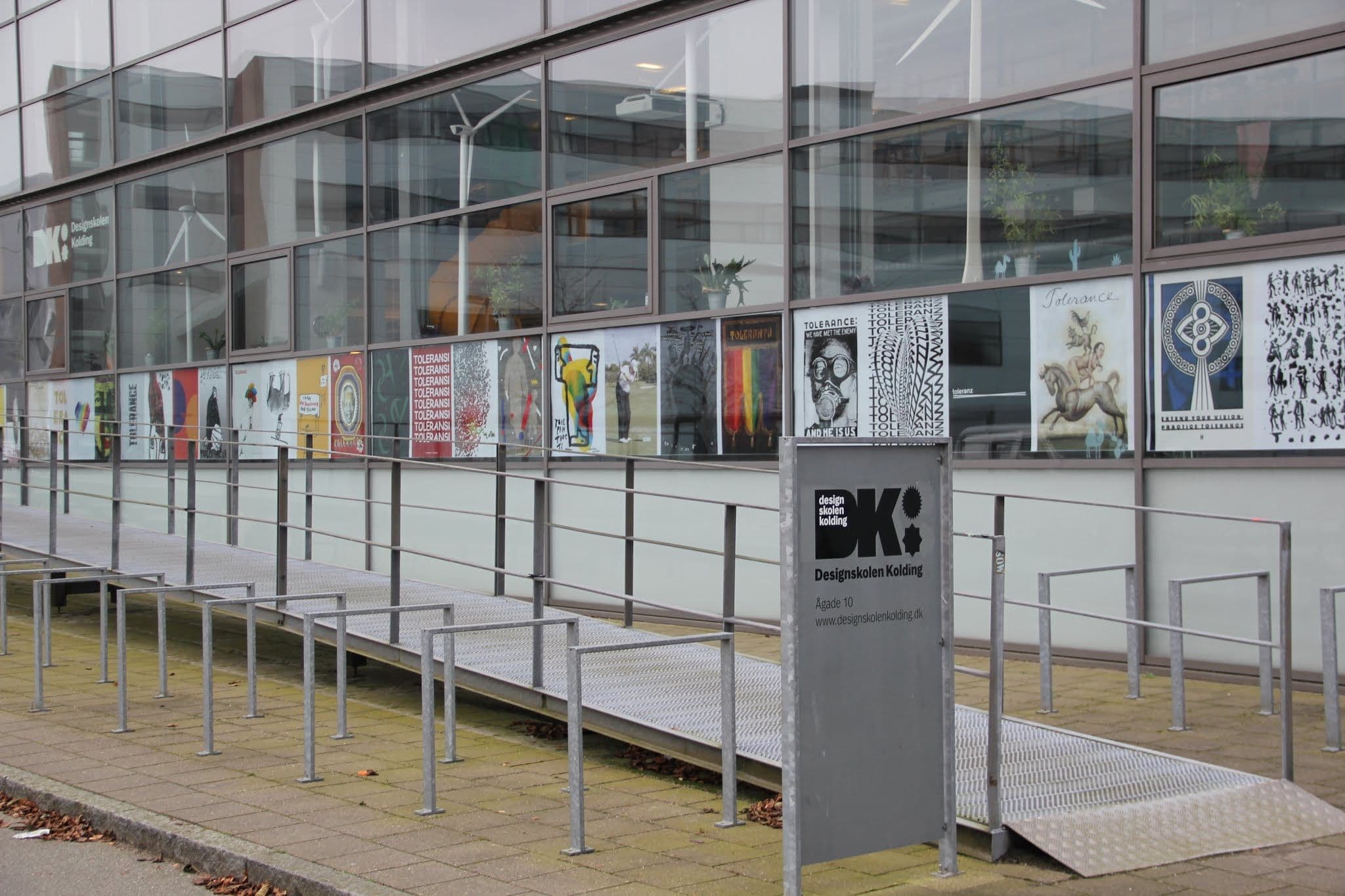 On December 3rd the Tolerance Poster Show opened at the university Design School Kolding in Kolding, Denmark. The posters are being exhibited in the window grid running in one long band around the university building, so it could be seen from the street.