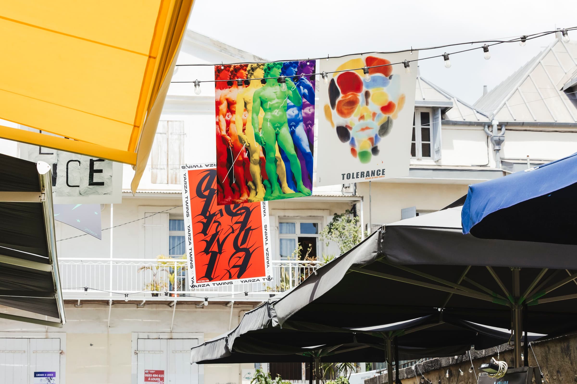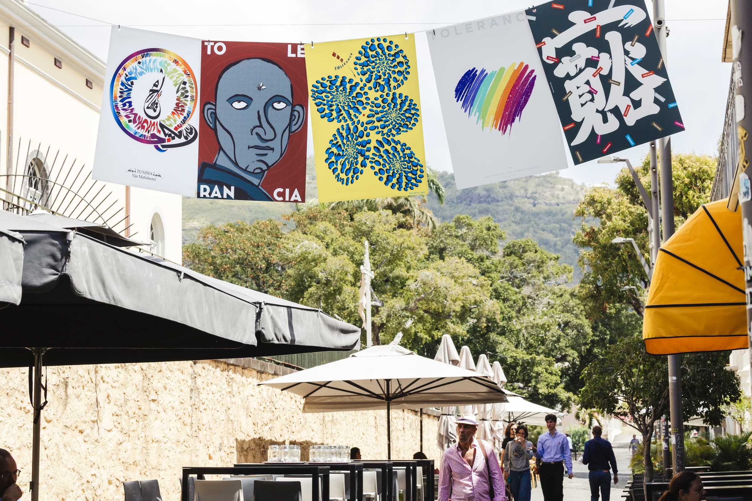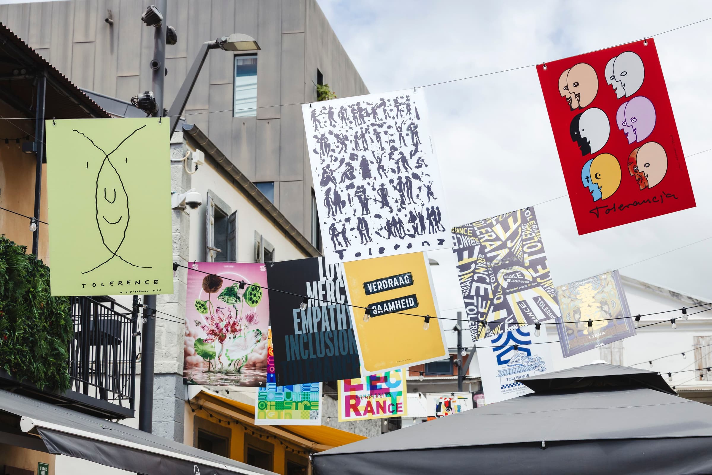 The Tolerance Poster Show opened on September 12th, 2025, on La Réunion as part of France Design Week 2025. The show was installed at Carré Cathédrale in Saint-Denis, a central and vibrant location where locals, visitors, and passersby converge—giving the posters an original context above terraces and communal spaces.
